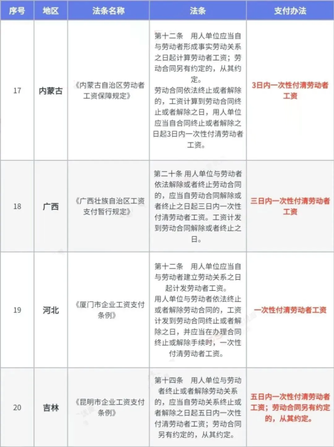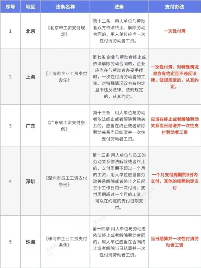 如果离职单位所在地,没有具体的关于工资支付的办法,则按照上述法律法规执行;但是如果各省市有具体的自己的规定的话,则依照当地规定执行。