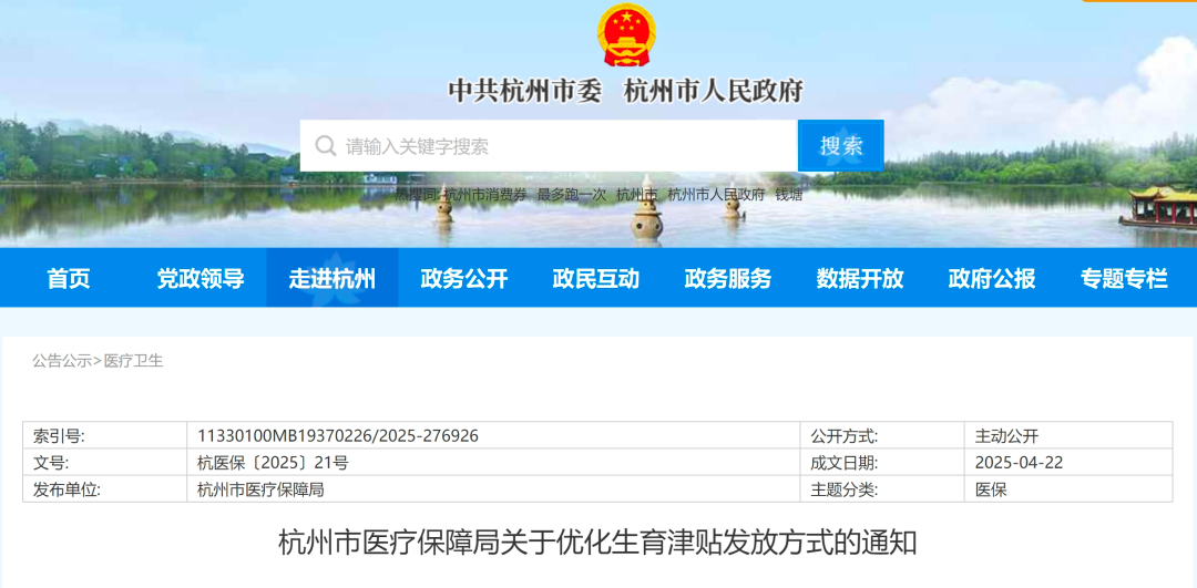 4月23日,杭州市医疗保障局发布《关于优化生育津贴发放方式的通知》,从2025年5月1日起,已按规定参加杭州市职工基本医疗保险(含生育保险)的用人单位在职职工,符合生育津贴申领条件的,可由参保人员或所在用人单位经办人申请,经医保经办机构审核通过后发放至参保人员本人银行账户。