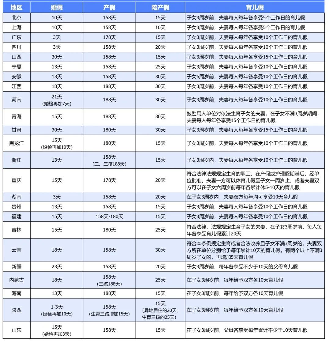 同时,各地积极推出育儿假,大部分省市都是10天。详见下表: